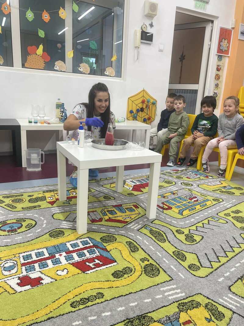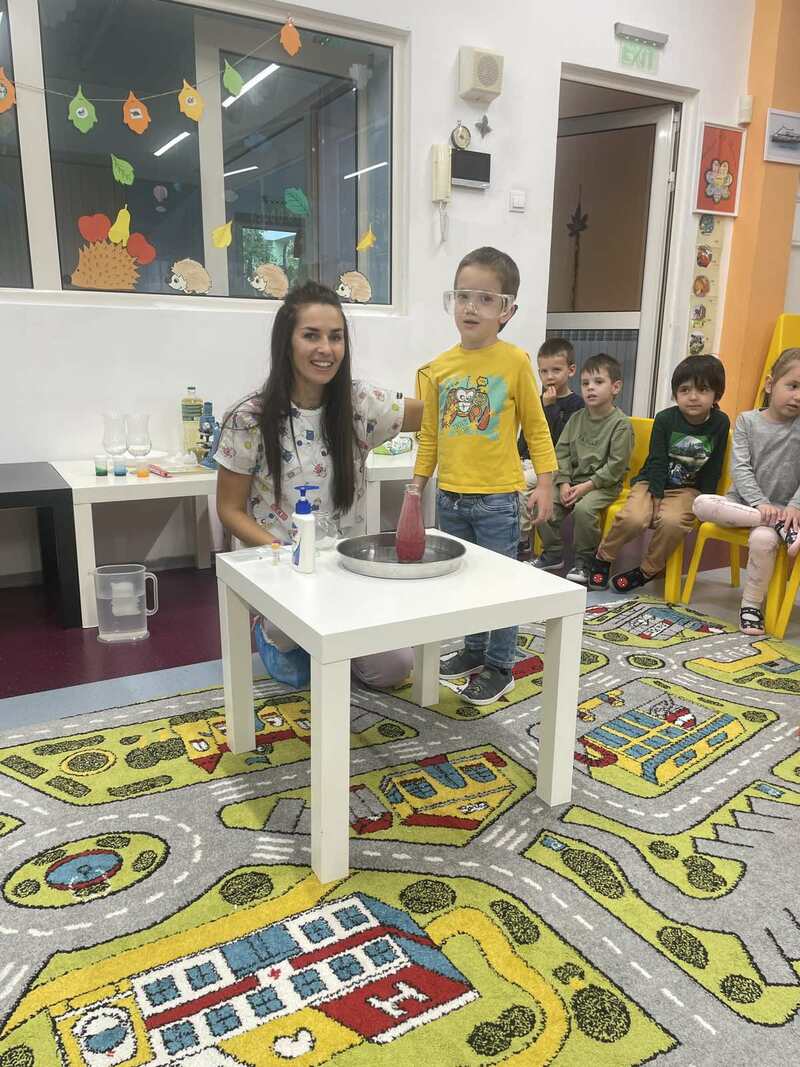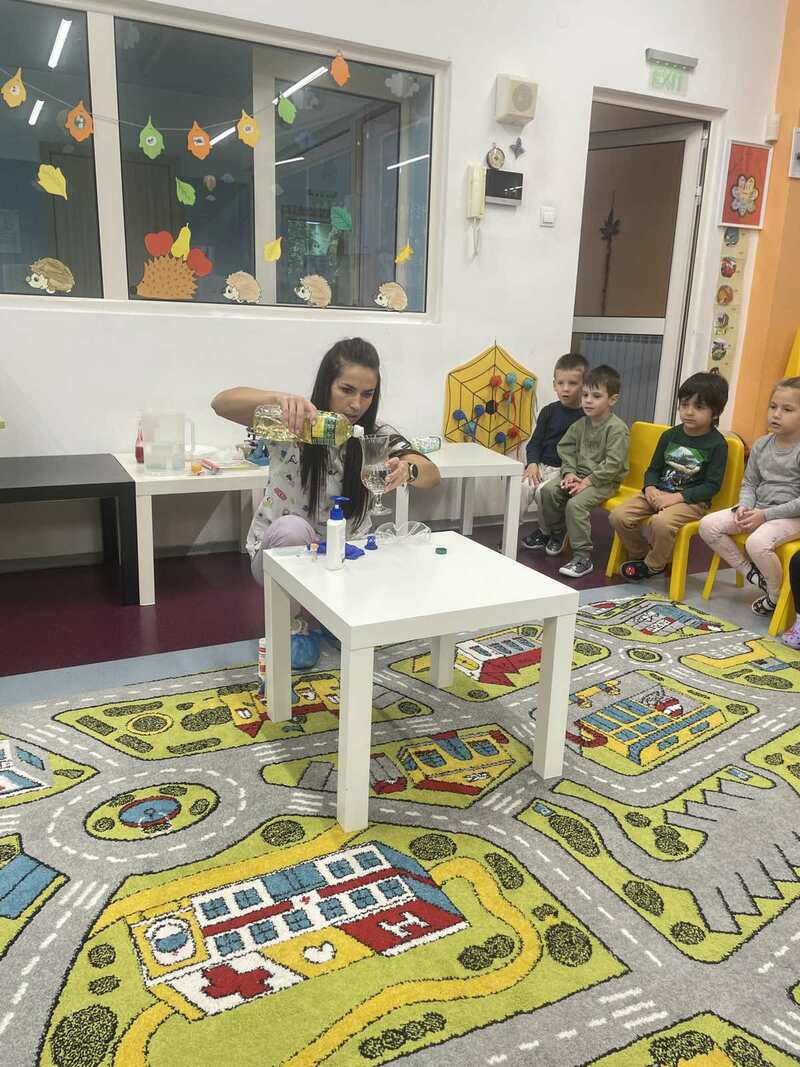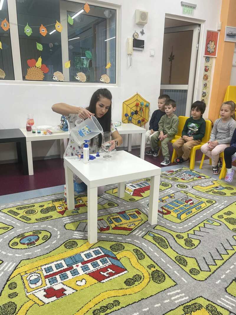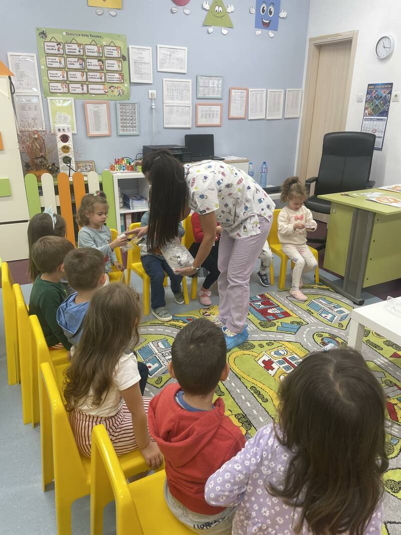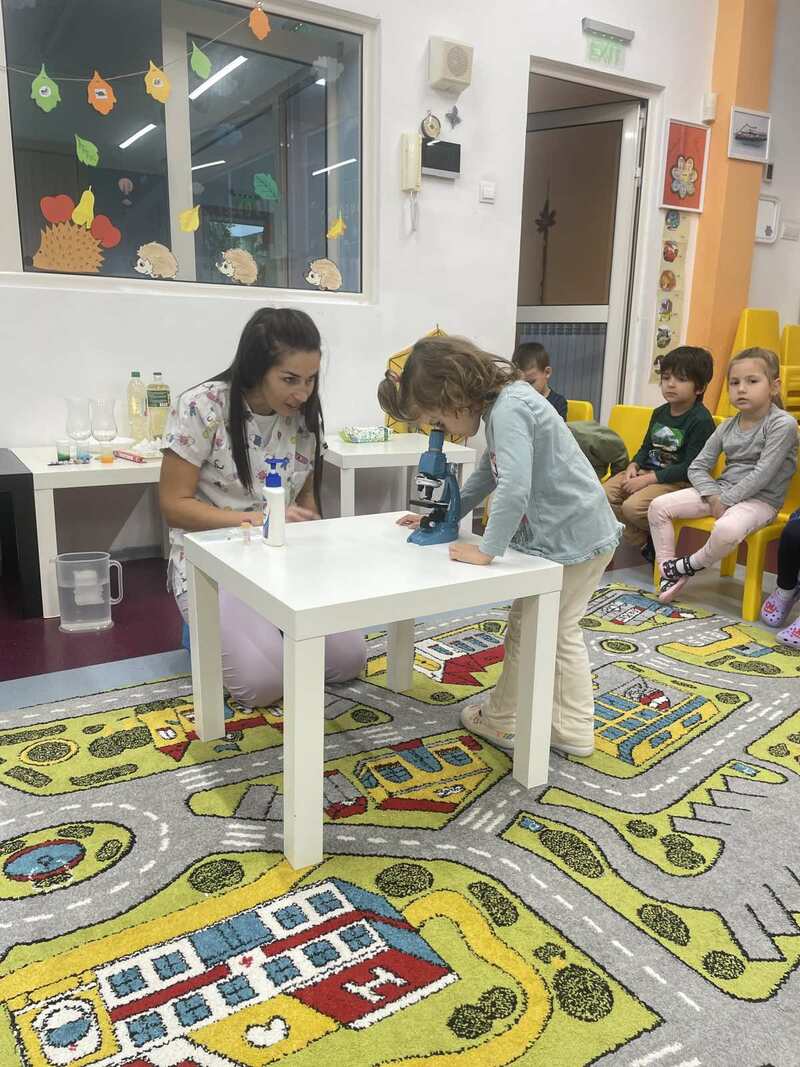 Първо разказа на децата за вирусите и бактериите, защо е важно да мием ръцете със сапун. Правиха опити с епруветки, гледаха “г-н Лук” през микроскоп. И накрая получиха много подаръци.