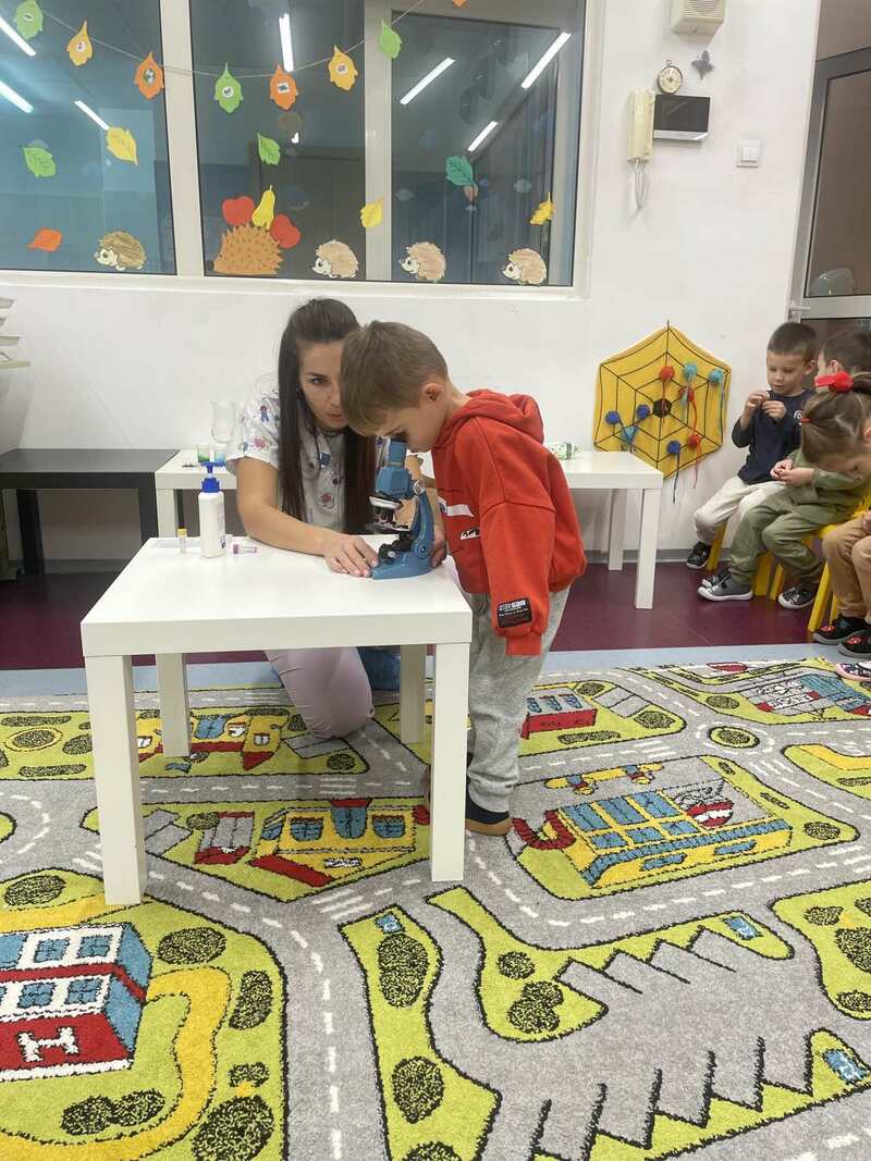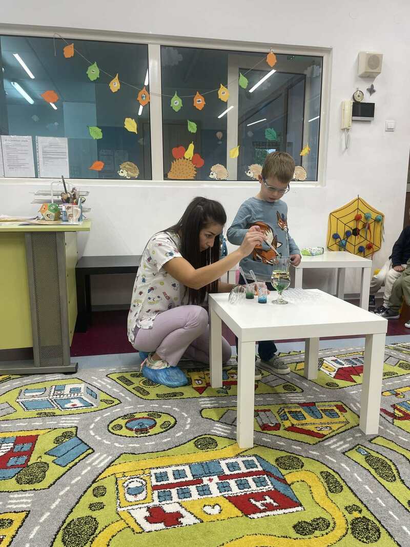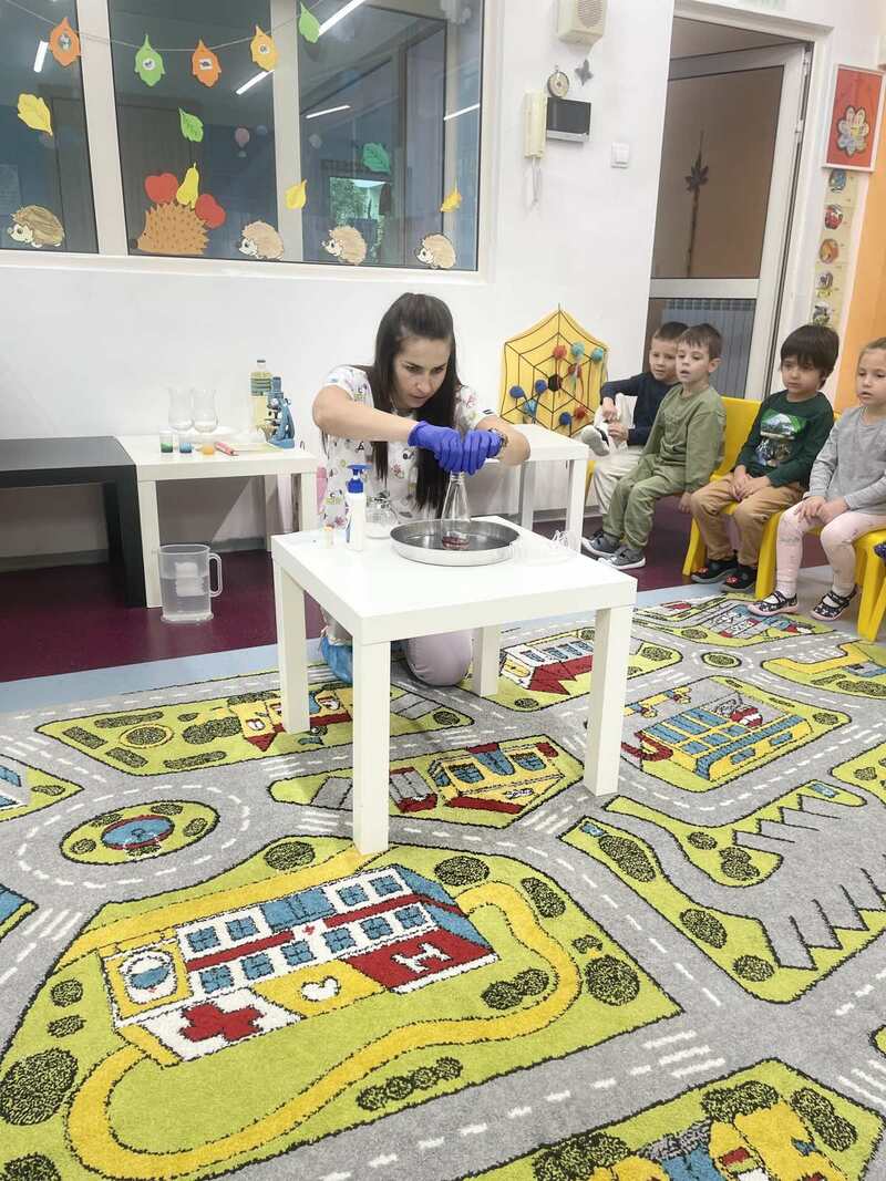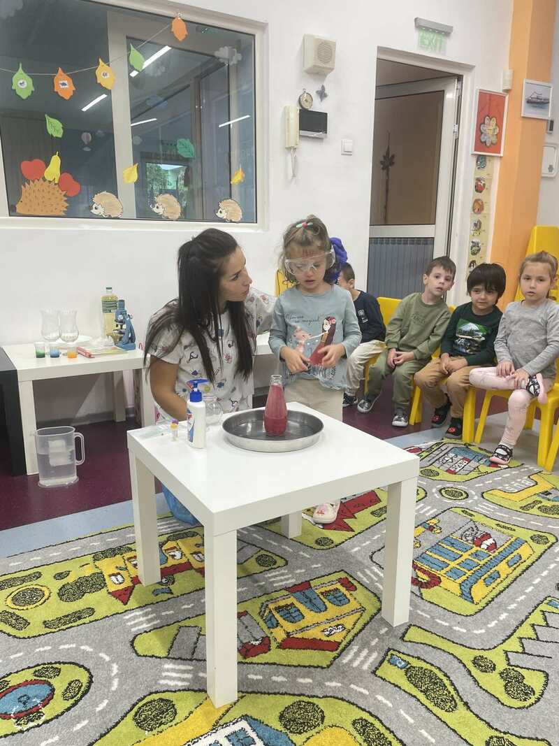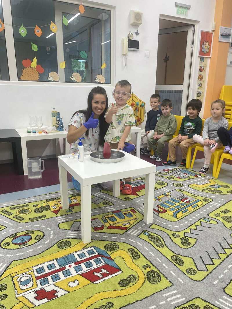 Първо разказа на децата за вирусите и бактериите, защо е важно да мием ръцете със сапун. Правиха опити с епруветки, гледаха “г-н Лук” през микроскоп. И накрая получиха много подаръци.