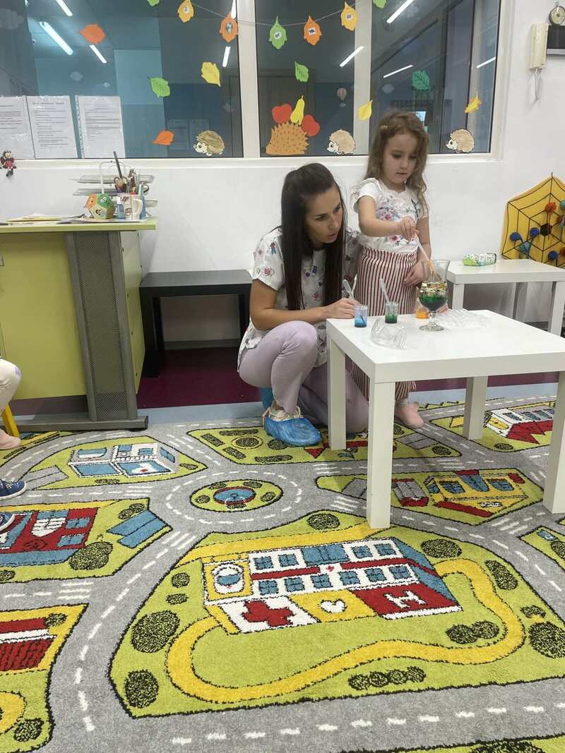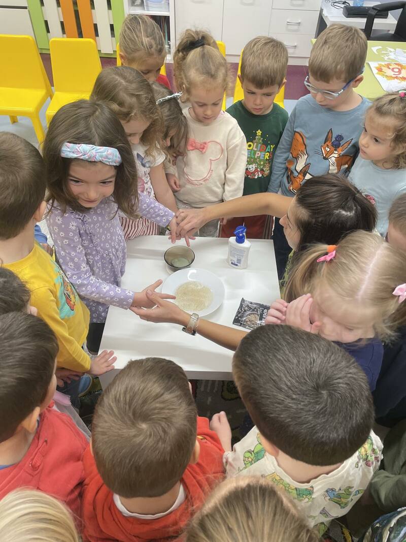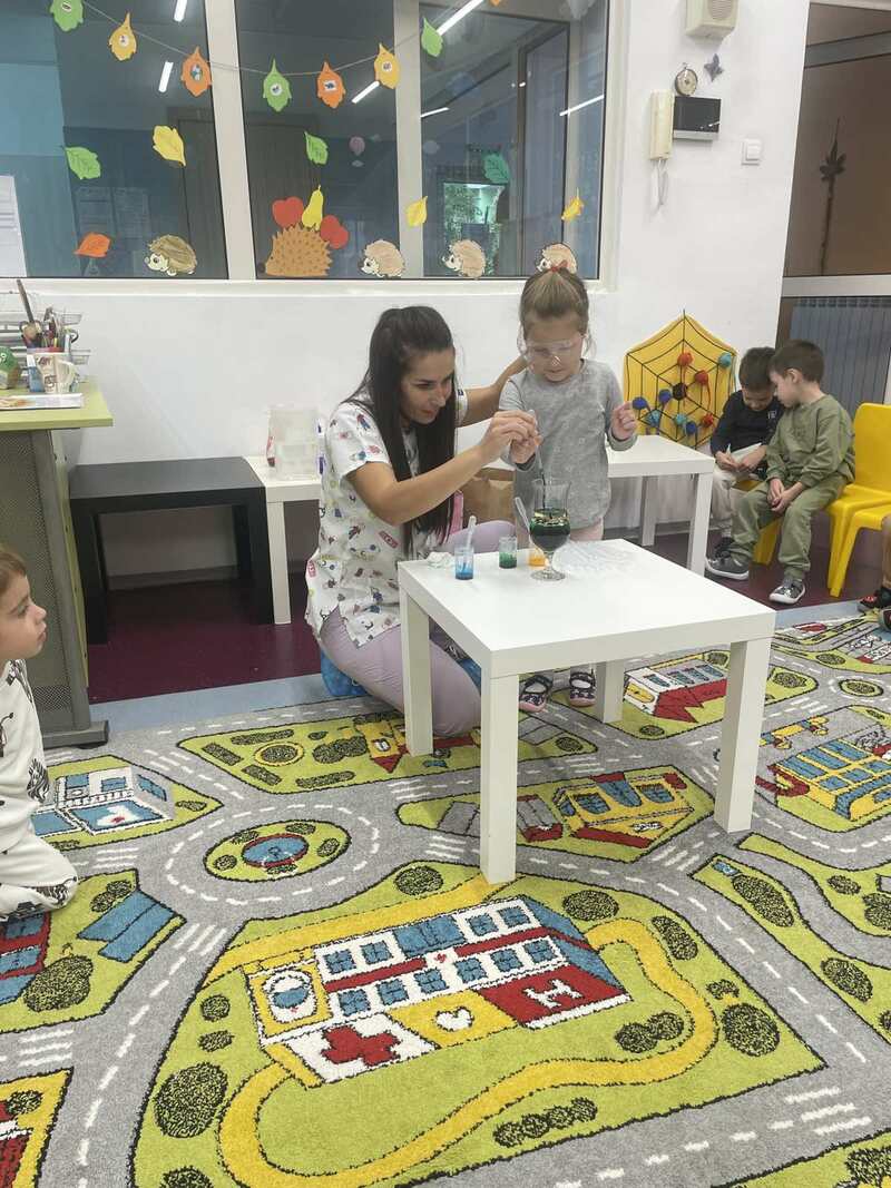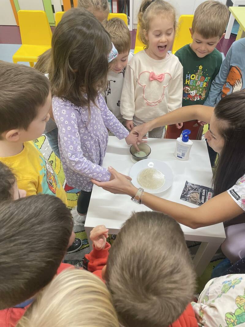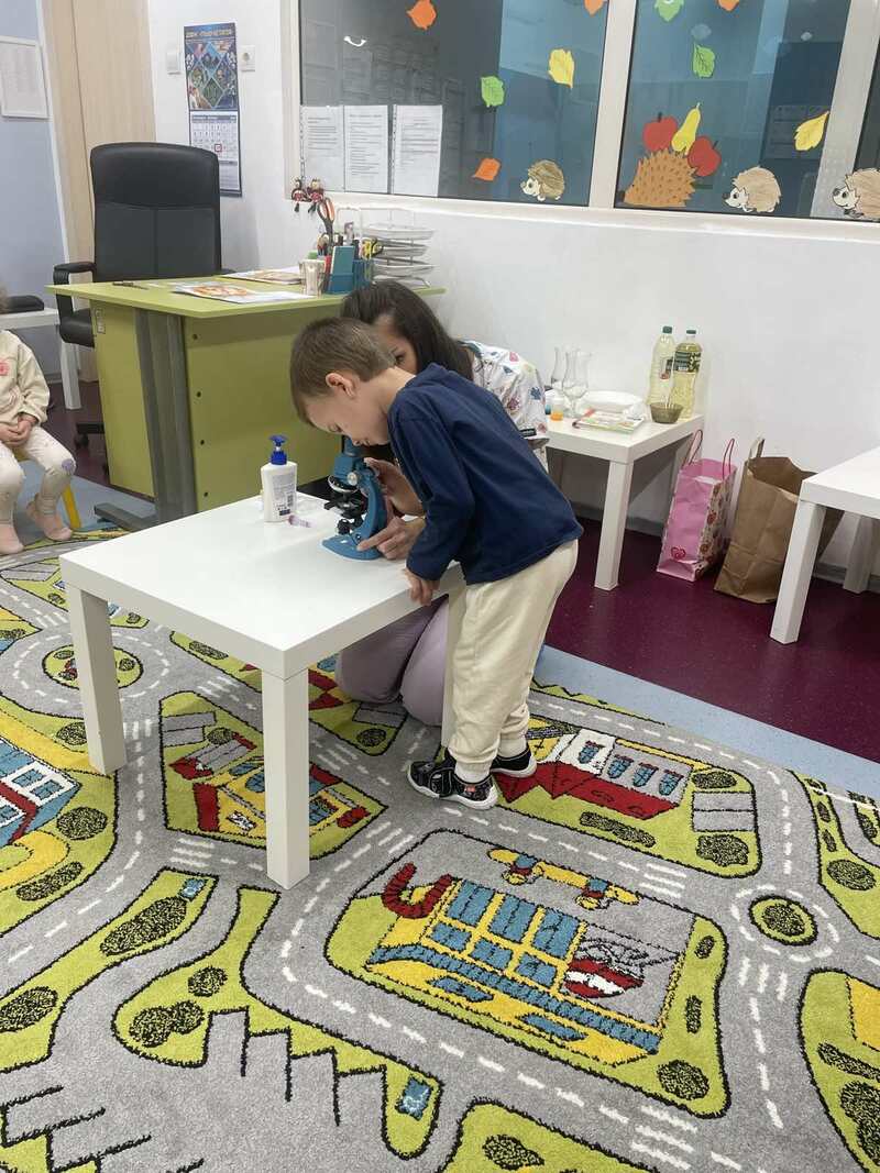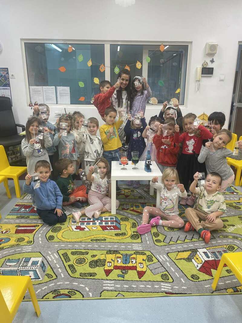 Първо разказа на децата за вирусите и бактериите, защо е важно да мием ръцете със сапун. Правиха опити с епруветки, гледаха “г-н Лук” през микроскоп. И накрая получиха много подаръци.