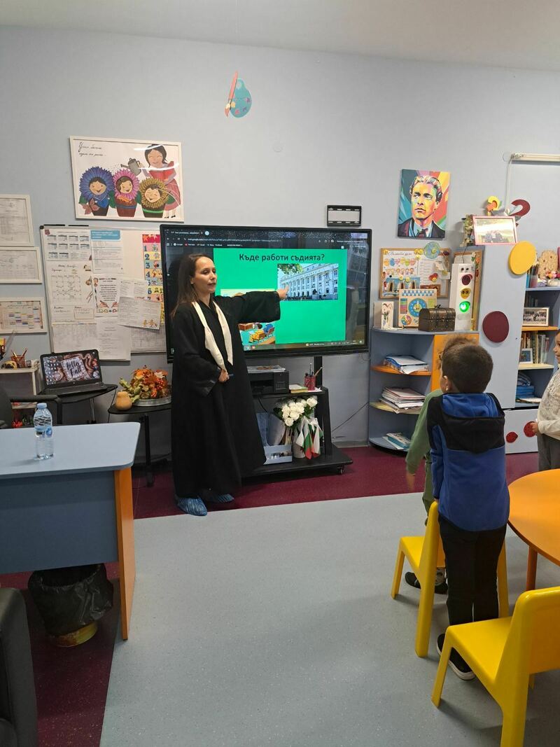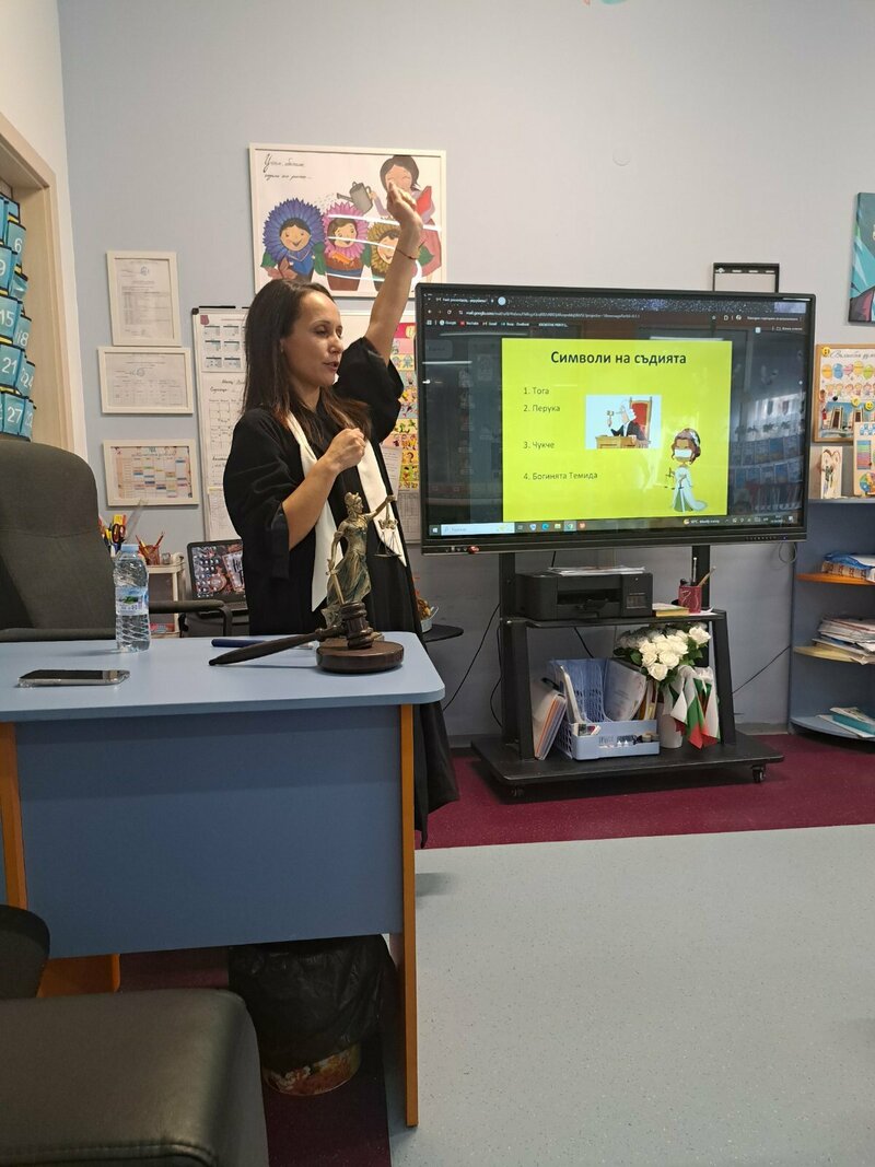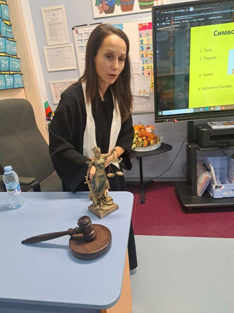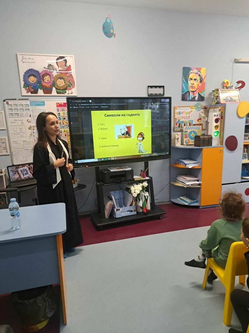Тя разказа на децата къде работи съдията, представи презентация, показа символите на съда – тога и чукче, както и сподели интересни факти за образа на Богинята Темида.