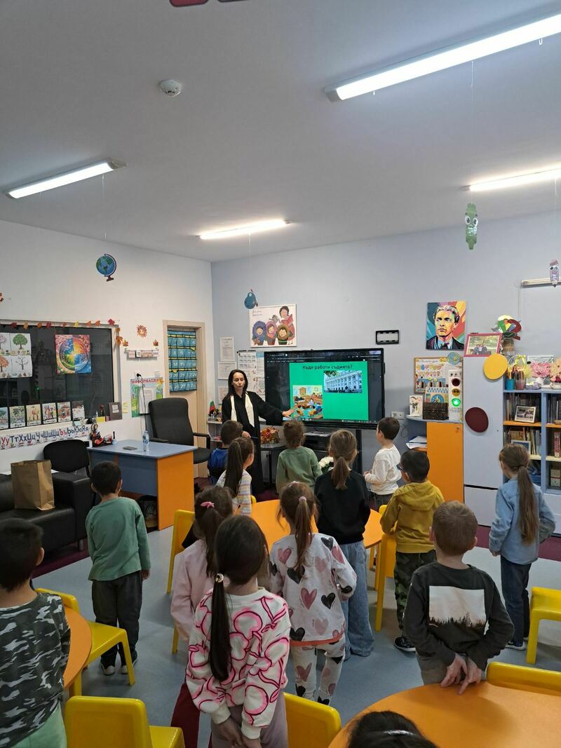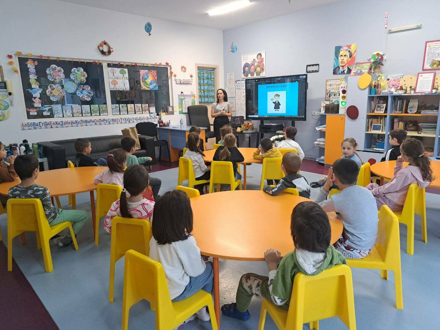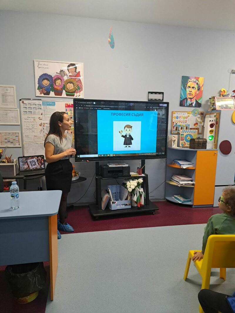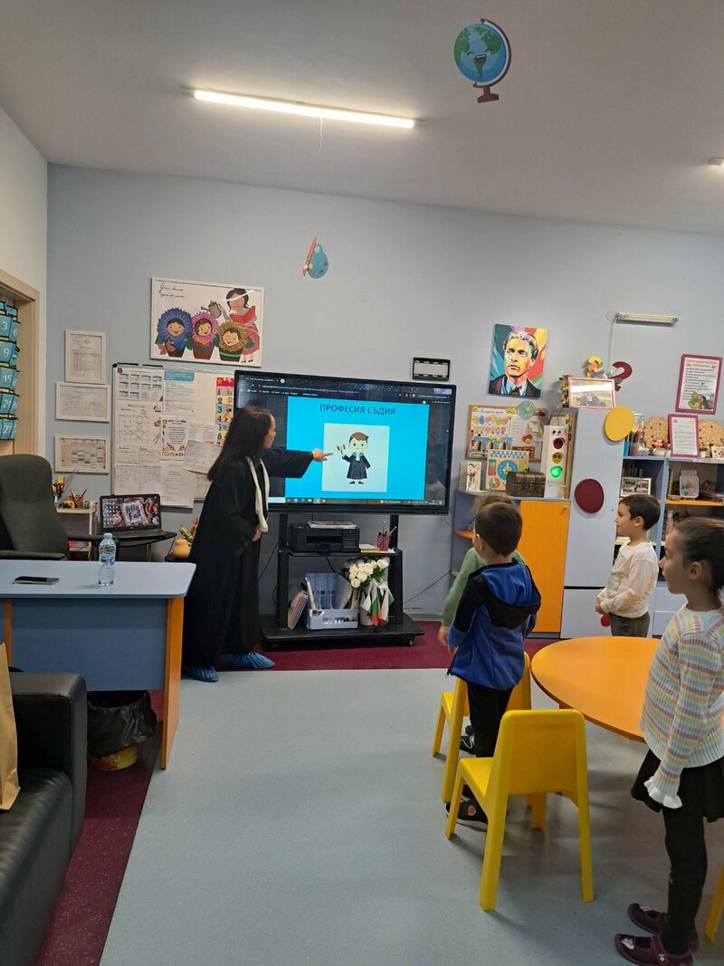 Тя разказа на децата къде работи съдията, представи презентация, показа символите на съда – тога и чукче, както и сподели интересни факти за образа на Богинята Темида.